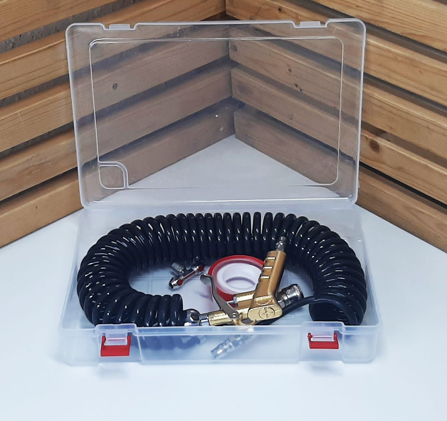 Пистолет продувочный,шланг,Т- образный переходник,нить для герметизации резьбы,пластиковый кейс.